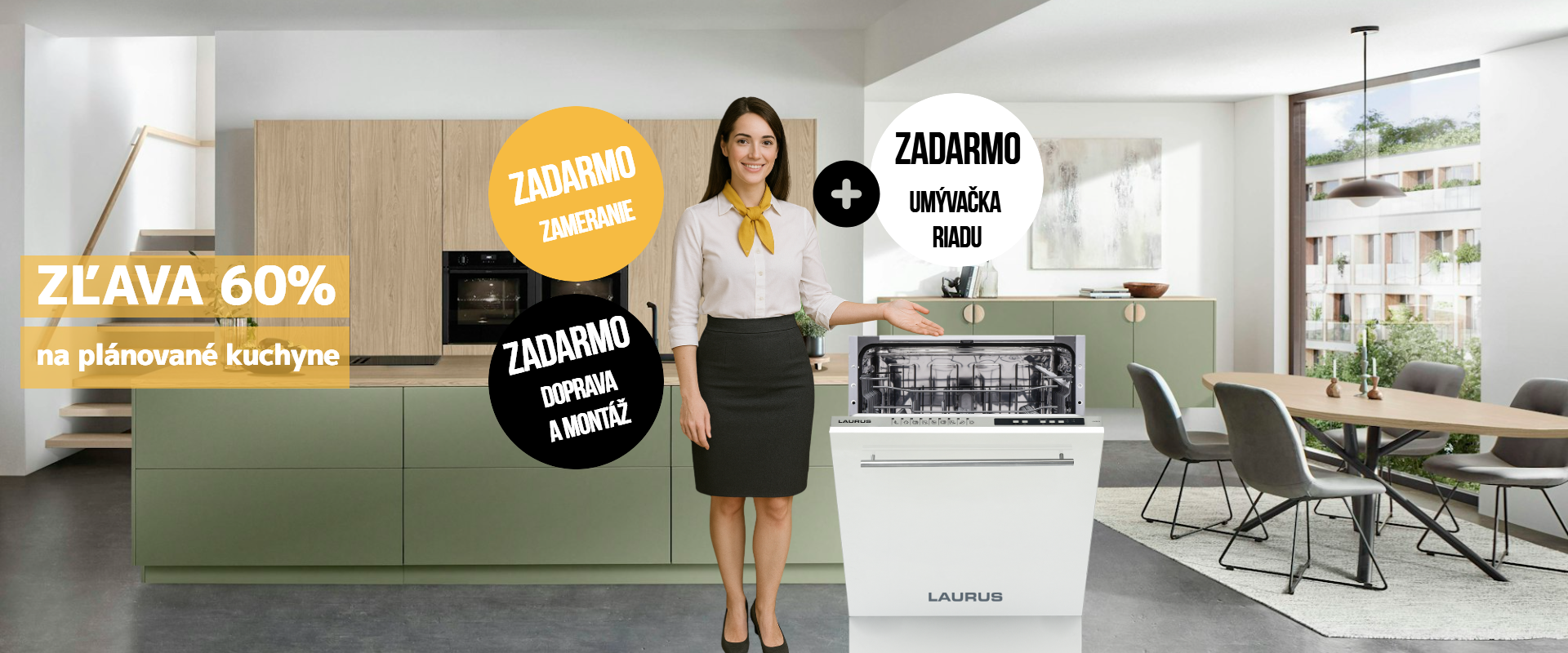 Zľava 60 % na plánované kuchyne značky AAA + ZADARMO zameranie, doprava a montáž pri nákupe plánovanej kuchyne v hodnote bez elektrospotrebičov nad 3.000 € + ZADARMO umývačka riadu sa vzťahuje na nezáväzné odporúčané ceny. Zameranie, dopravu a montáž ZADARMO možno uplatniť len pri nákupe plánovanej kuchyne Nobilia v hodnote nad 3.000 € bez spotrebičov. Umývačka riadu zdarma sa vzťahuje na kolekciu umývačiek riadu od výrobcu značky LAURUS. ZADARMO je ponúknutá vždy z rovnakej alebo približnej modelovej rady. Po uplatnení zľavy nemôžu byť poskytnuté žiadne dodatočné zľavy. Akcia platí do 31. 10. 2025 len na novo uskutočnené objednávky a len v predajni na Račianska 26G, Bratislava.